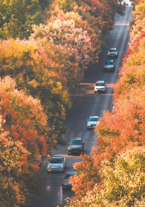 騎行在青云大道上,兩側(cè)柿子樹碩果低垂,青黃相間的柿子如燈籠綴滿枝頭,與欒樹的繽紛相映成趣。微風(fēng)過處,欒樹花簌簌飄落,少年騎車碾過金色花毯,驚起幾只啄食的麻雀。